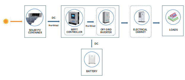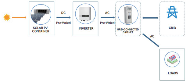 Aurinkomoduulin tuottama tasavirta muunnetaan vaihtosuuntaajassa vaihtovirraksi, joka syötetään sitten kuormaan ja liitetään verkkoon. Tällä tavalla kotitalouden kuormitusta vastaan voidaan myös myydä ylimääräistä sähköä verkkoon.